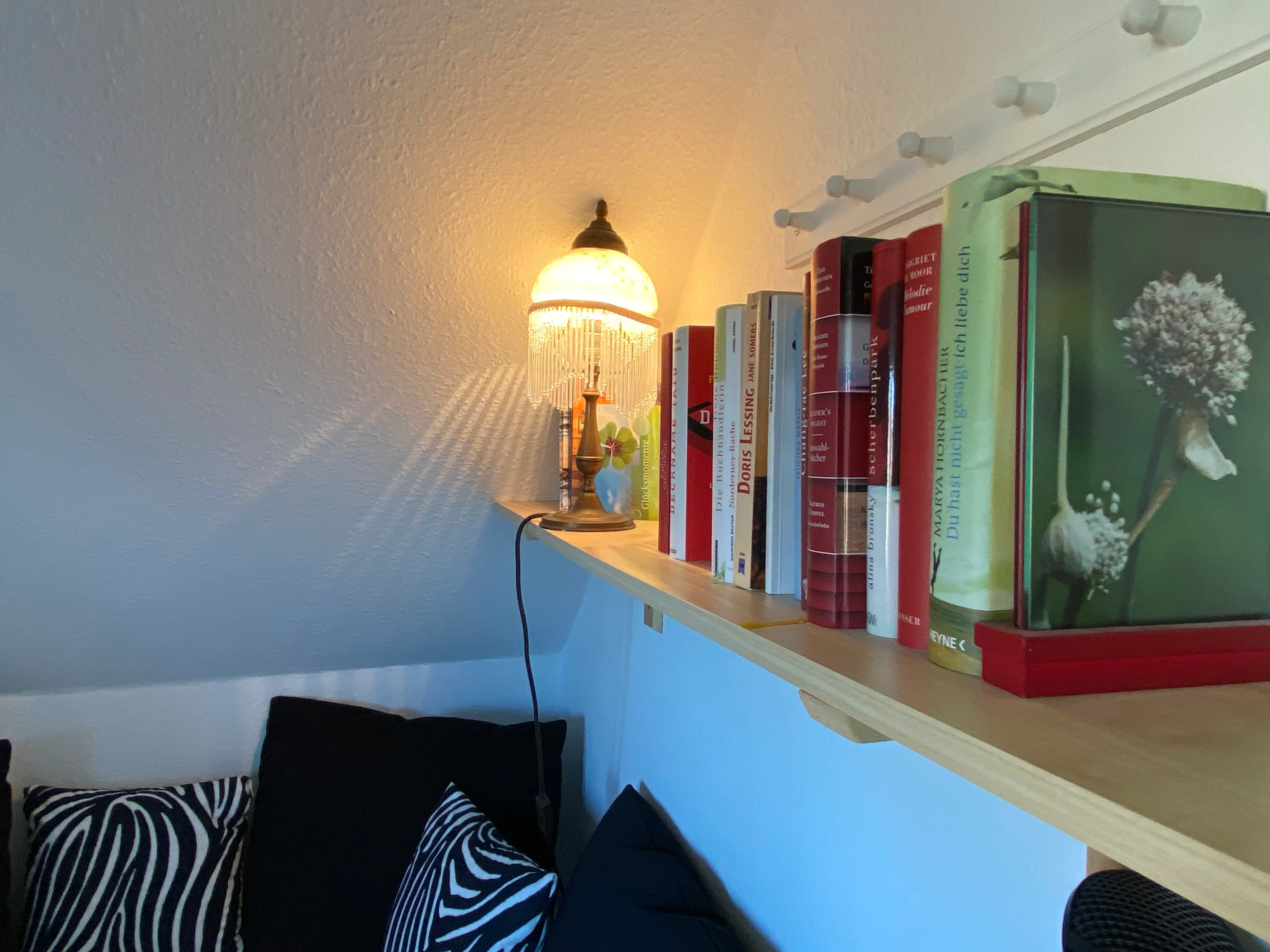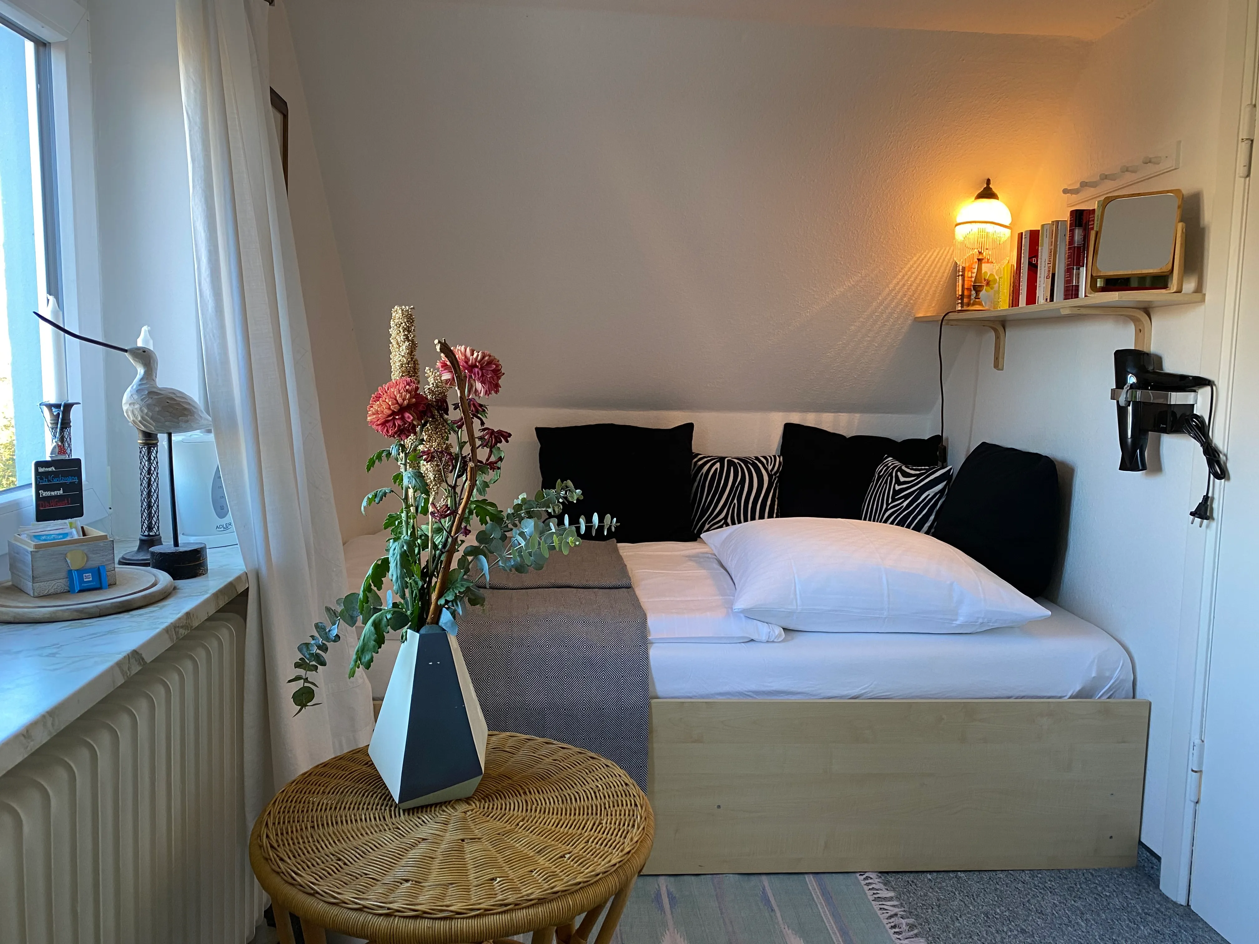 Alles, was man braucht in der gemütlichen kleinen Mansarde: 140 x 200 cm - Nischenbett, hyggeliger Teppich und eine Sitzecke für ruhige Stunden.
