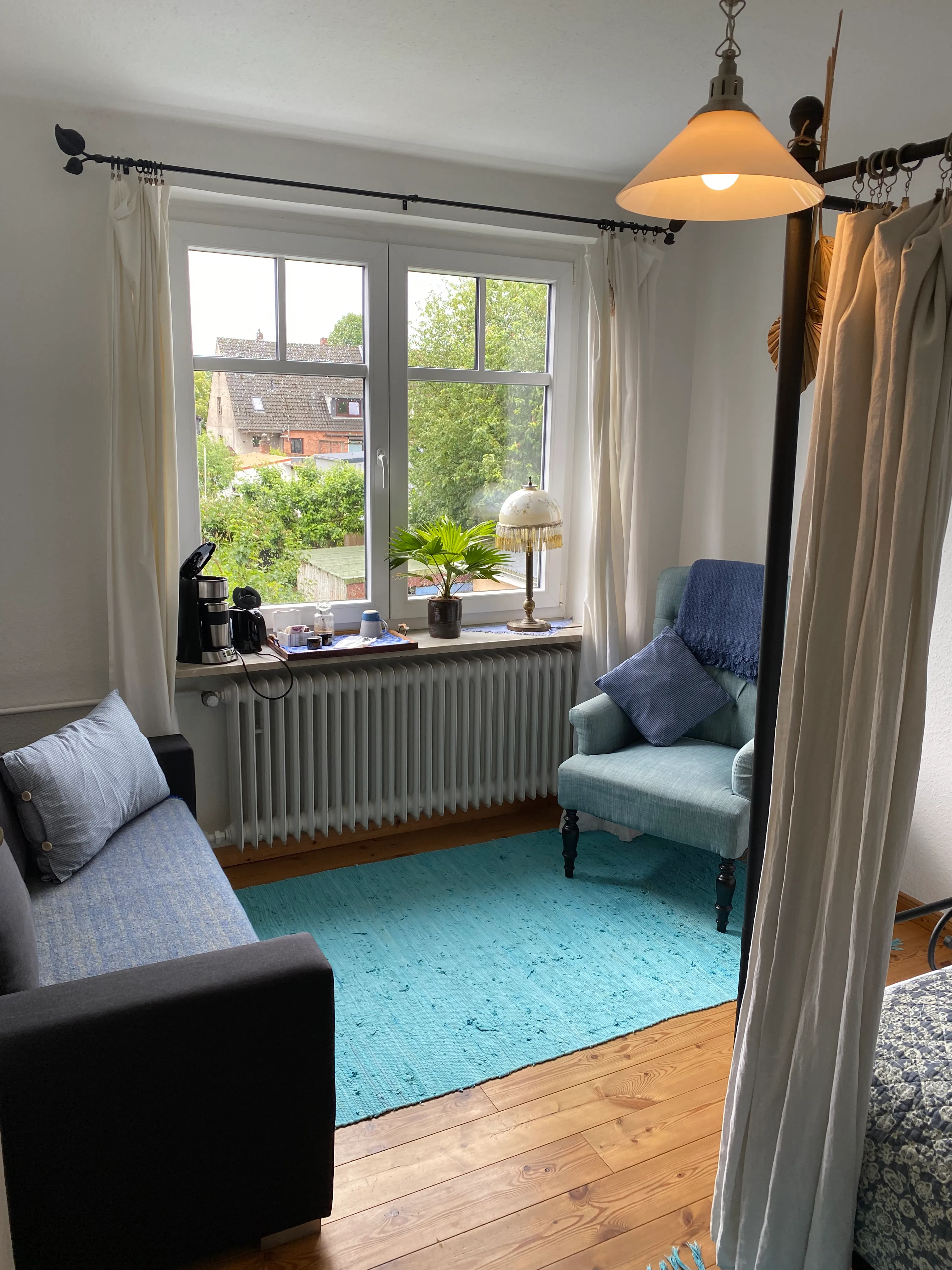 Ruhige Innenhoflage für Paare und Familien. Sie schlafen im Himmelbett (140x200). Ein Schlafsofa (120x200) bietet zusätzlichen Schlafplatz. Genießen Sie den schönen Ausblick zum idyllischen Garten und in die Silhouetten der malerischen Stadt Husum. Nutzung der vollausgestatteten hochwertigen Gemeinschaftsküche zur Selbstversorgung und des modernen Gemeinschaftsbades, in dem für jedes Zimmer ein separater Waschtisch mit Abstellmöglichkeit installiert ist. Im Erdgeschoss des Hauses ist ein zusätzliches Gäste-WC vorhanden.