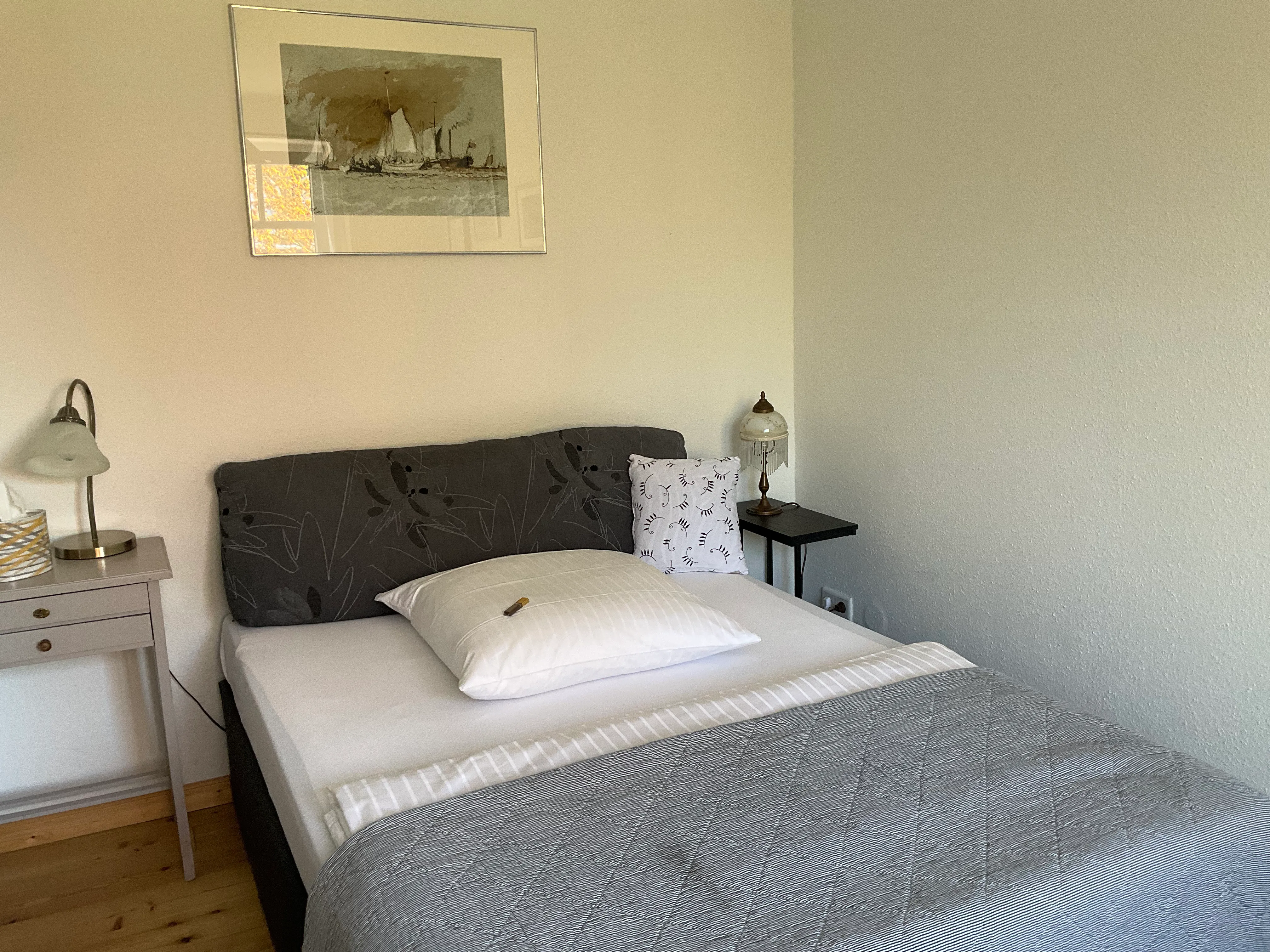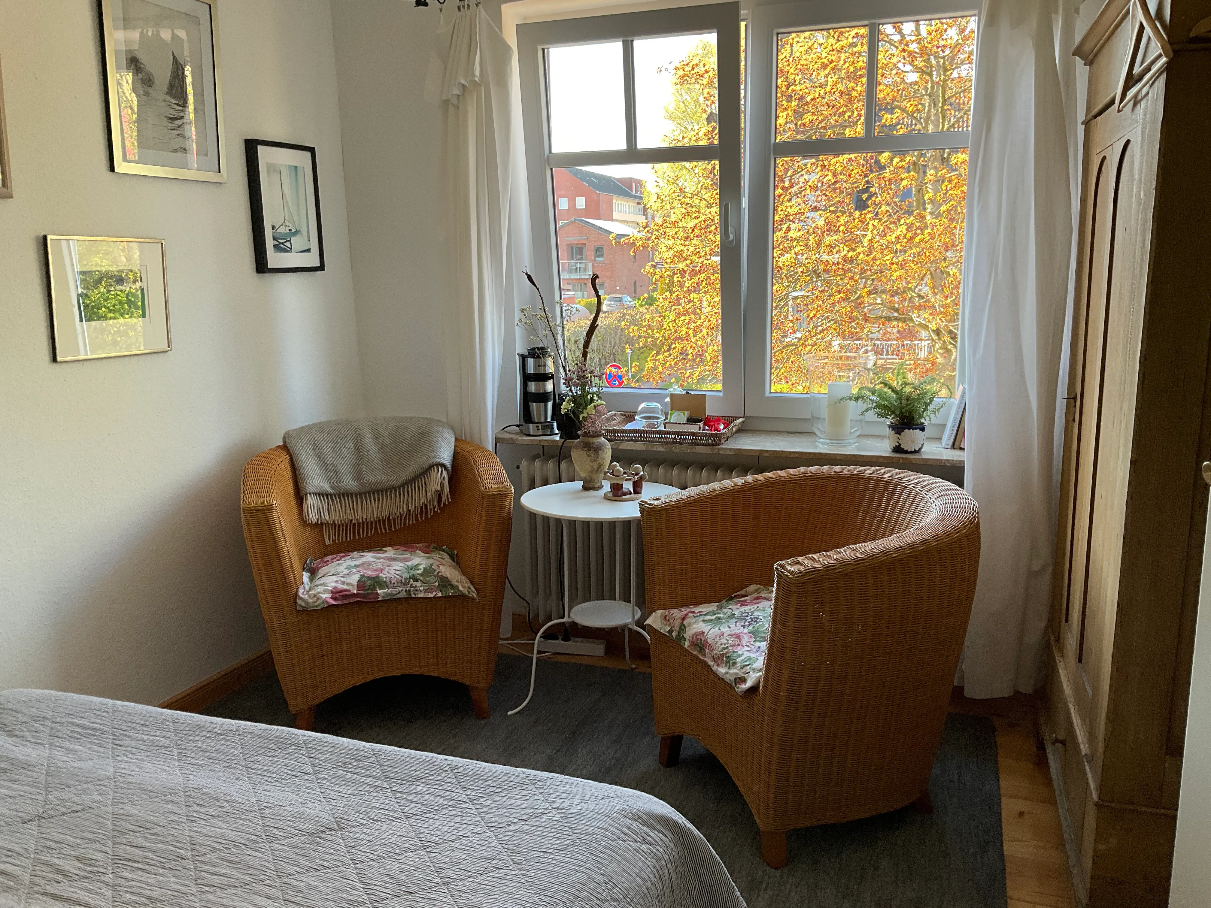 Lassen Sie sich nach einer anstrengenden Reise oder einem Tag voller Eindrücke in das gemütliche Boxspringbett fallen. Oder darf es ein wenig Auszeit in den zwei gemütlichen Korbsesseln sein? Von hier aus haben Sie einen herrlichen Blick auf die pittoresken Villen der Woldsenstraße. Nutzung der vollausgestatteten hochwertigen Gemeinschaftsküche zur Selbstversorgung und des modernen Gemeinschaftsbades, in dem für jedes Zimmer ein separater Waschtisch mit Abstellmöglichkeit installiert ist. Ein weiteres Gäste-WC befindet sich im Erdgeschoss des Hauses.